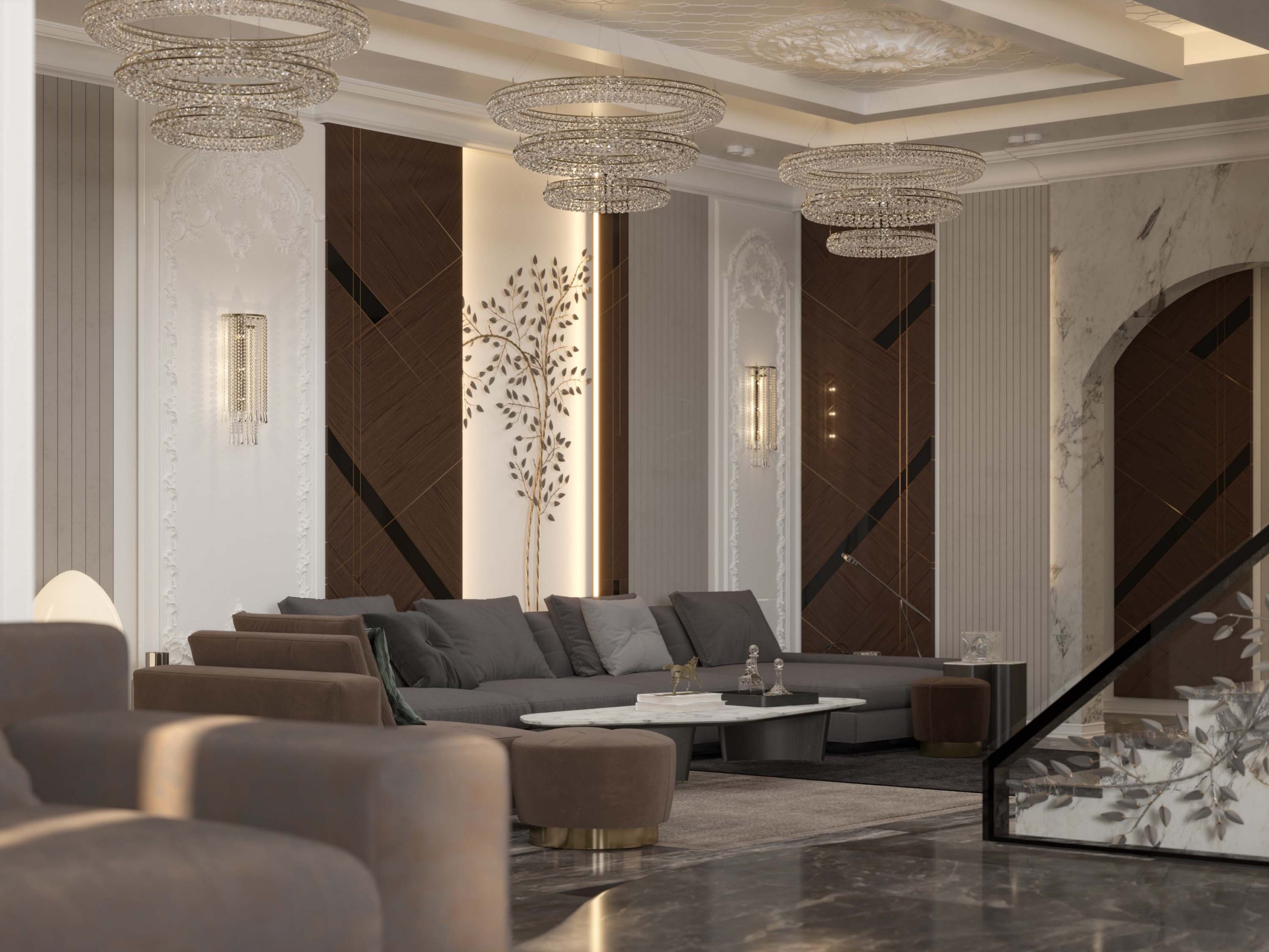 golden tables in the center , also TV set surrounded with marble , however the side sitting area showing in this render .